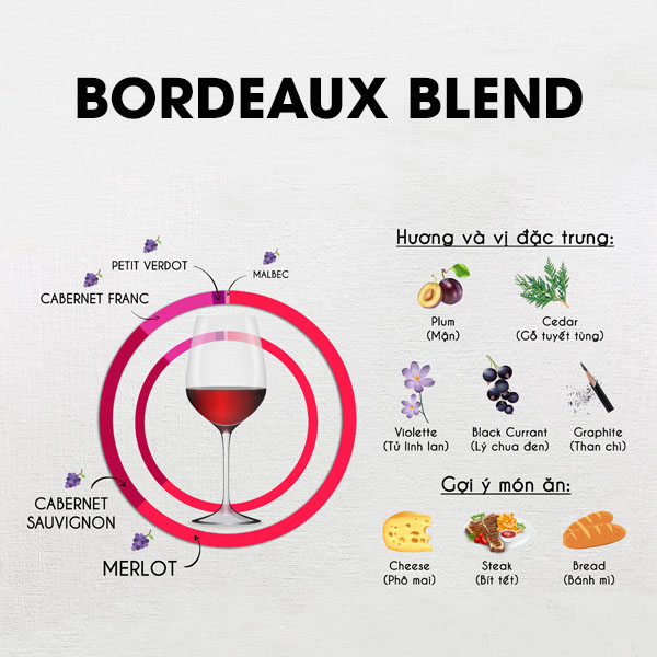 Vang đỏ Bordeaux Một điều quan trọng bạn cần biết về rượu vang Bordeaux đó chính là chúng là rượu vang được pha trộn từ nhiều giống nho. Rượu vang Bordeaux đa số (hơn 90%) đều là rượu vang đỏ được làm chủ đạo từ hai giống nho đỏ Cabernet Sauvignon và Merlot. Ngoài ra còn một phần nhỏ bao gồm nho Cabernet Franc, Petit Verdot và Malbec. Rượu vang Bordeaux có thể là những loại vang để bàn (table wine) cho tới những chai vang đắt tiền và danh tiếng nhất thế giới. Giá rượu vang Pháp cũng tùy vào vintage và phân hạng rượu vang mà có sự khác nhau.